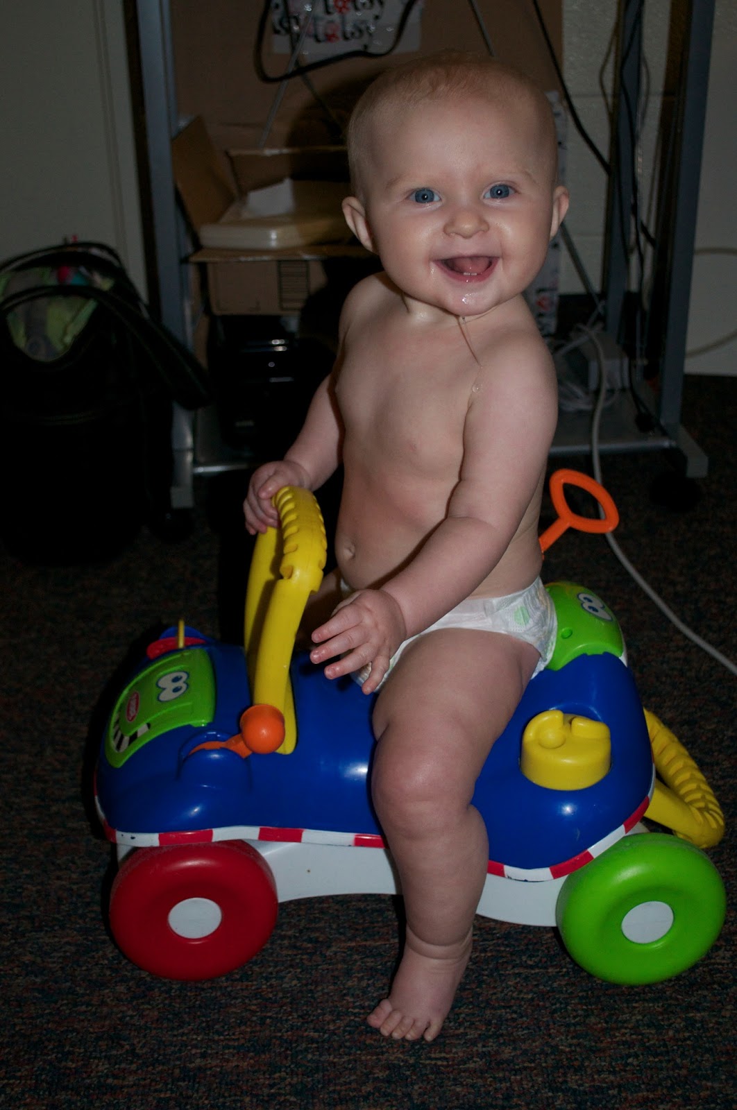 Despite the fact that most infants her age are rolling around and crawling, Emma just has no interest in it. She has hated being on her tummy since she was born, so any position on her tummy is torture for her. We are working on tummy time and she is getting better at rolling and holding herself up, but not without a fight.